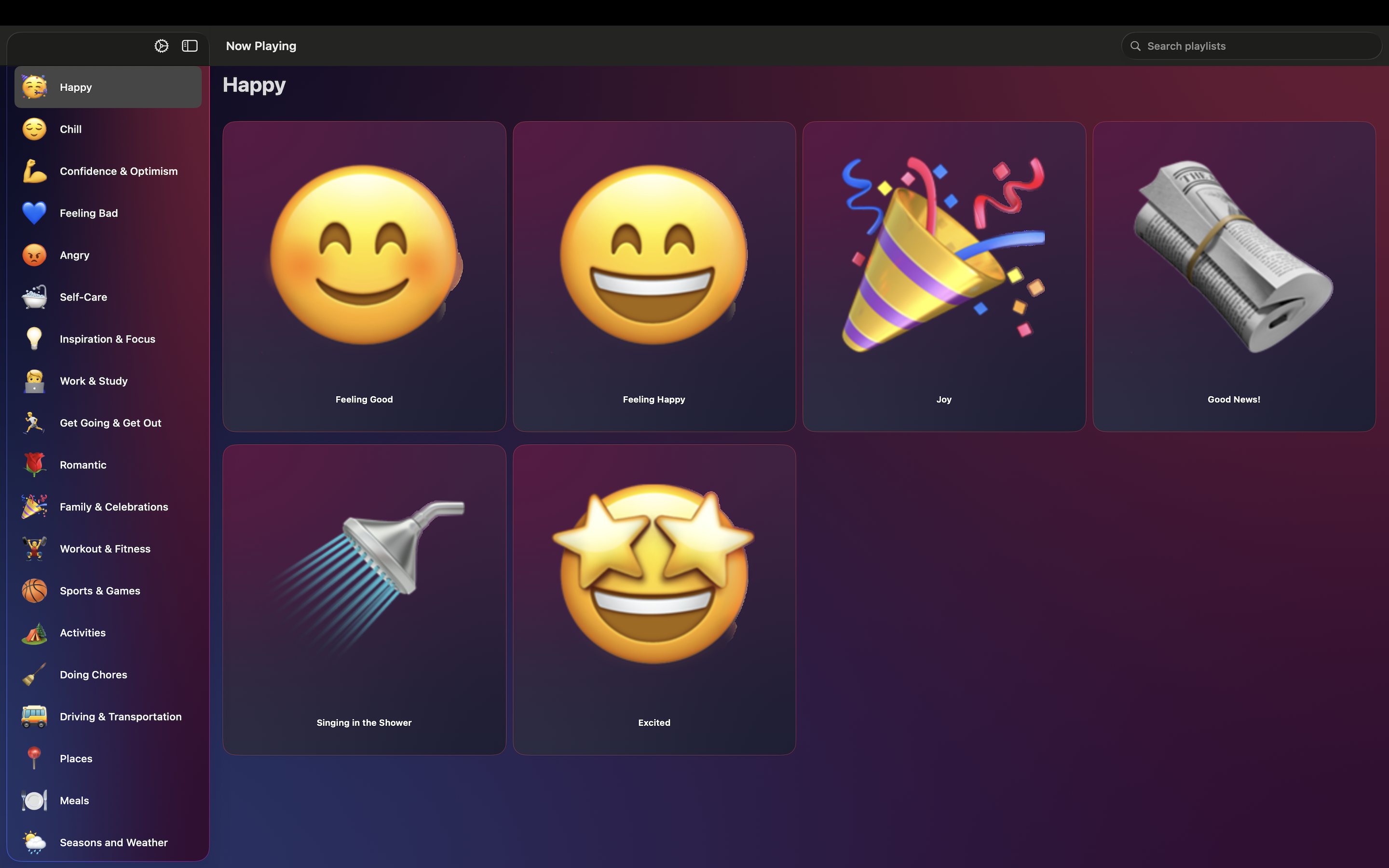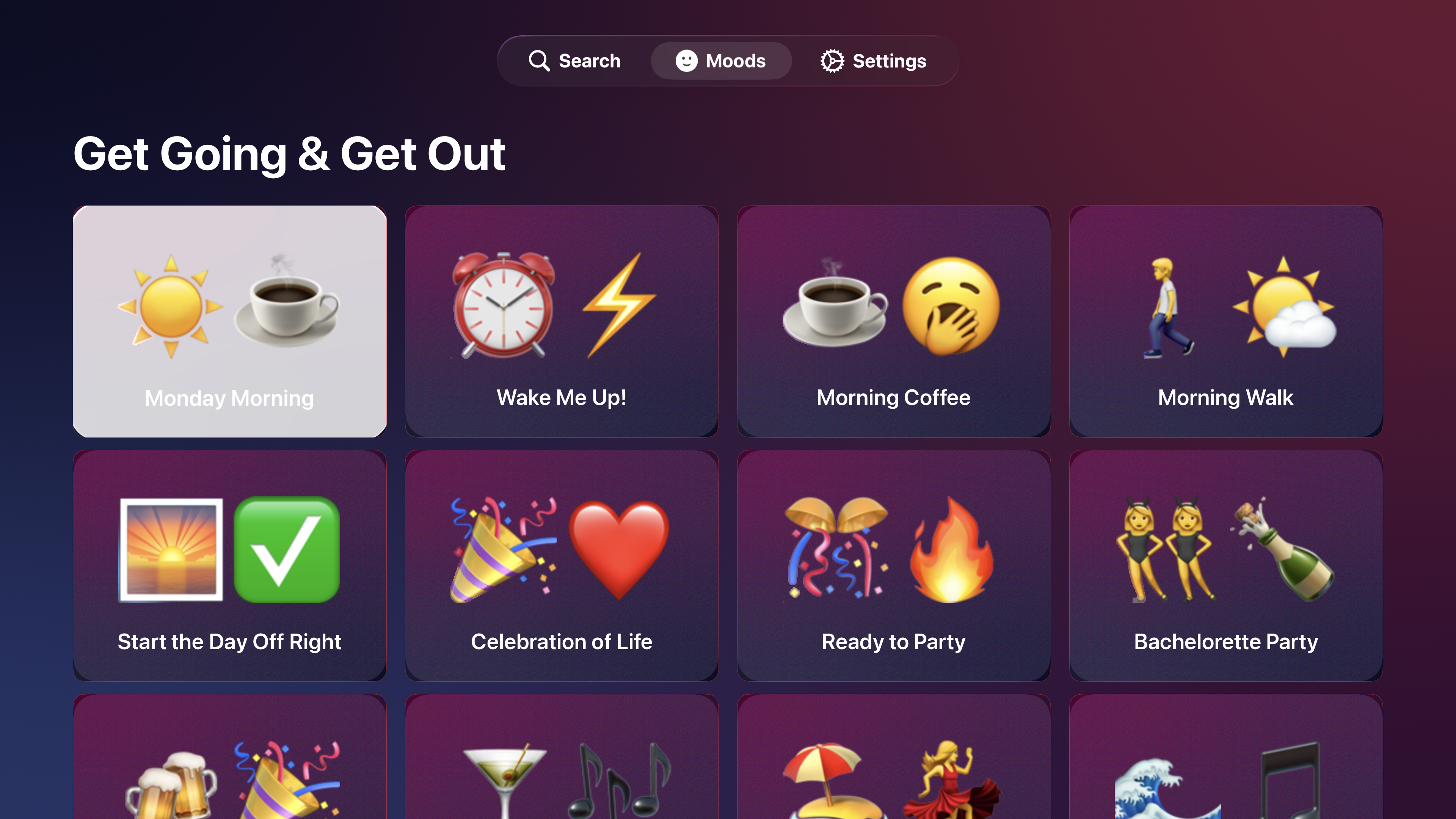 - 250+ curated Apple Music playlists organized by mood, activity, and vibe